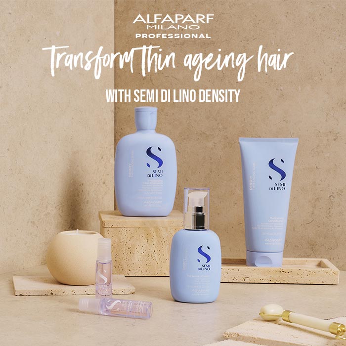 Alfaparf Density is specifically designed for treating thin, ageing hair. This Alfaparf Semi di Lino range provides thickness and vitality to the hair fibre, targeting clients experiencing weakening of the hair due to stress and hormonal changes. The innovative Filler Complex acts internally and externally on the hair fibre so it regains thickness and vitality, for a youthful, thick and healthy appearance!