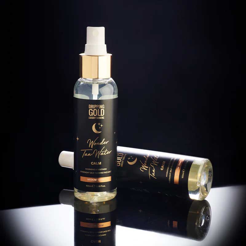 Dripping Gold Wonder Water Calm in Medium-Dark is the ultimate overnight self-tanning mist that hydrates and soothes your skin while you sleep. This innovative formula leaves you with a beautifully bronzed and refreshed complexion by morning. Embrace effortless tanning with this hydrating wonder.