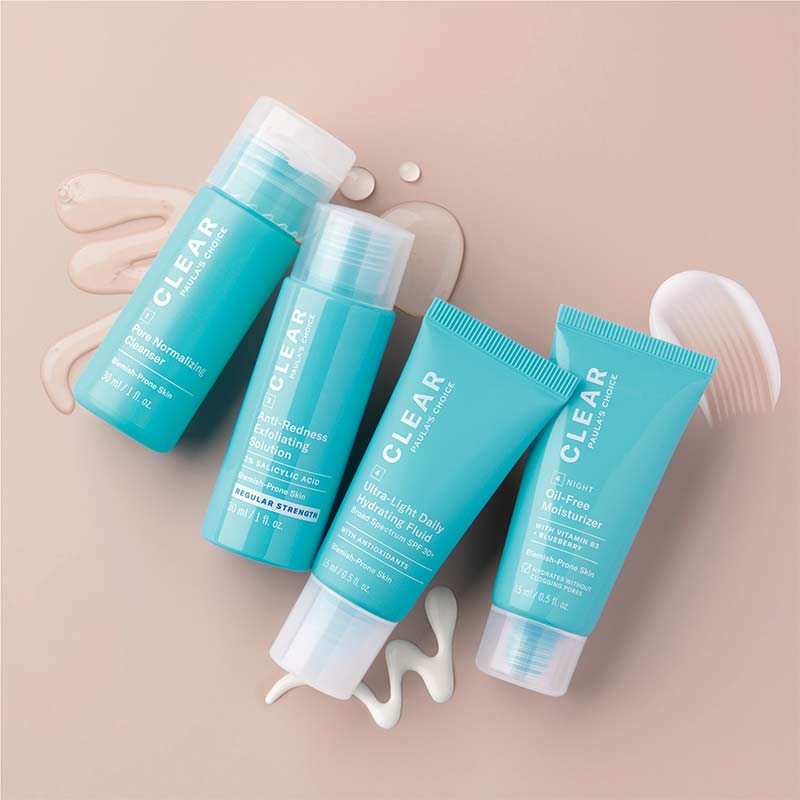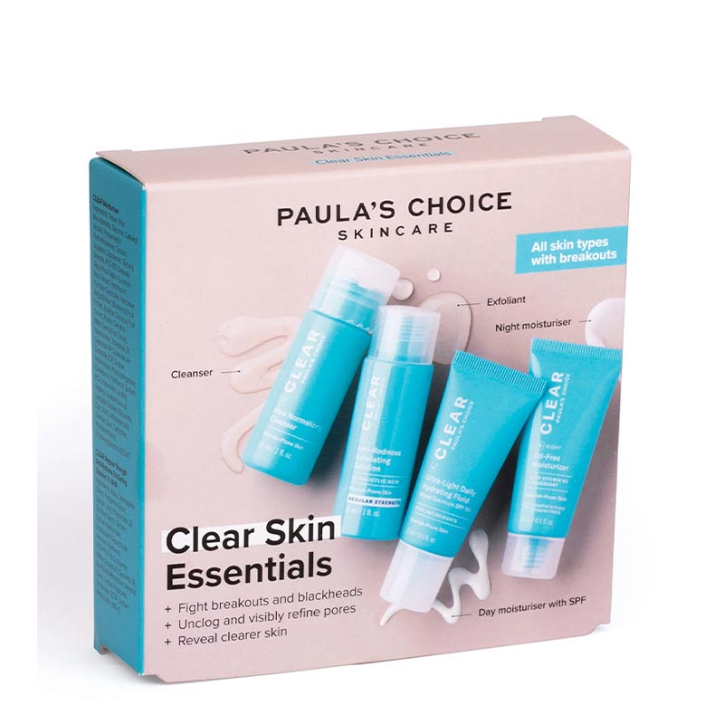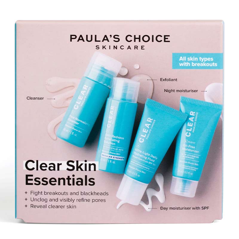 Paula's Choice Regular Strength Clear Skin Essentials Kit is a skincare routine trial kit including bestselling cleansers, exfoliants and moisturisers from the Paula's Choice range, to reveal your clearest skin yet with a skincare routine that will unclog pores, fights breakouts and minimise pores.