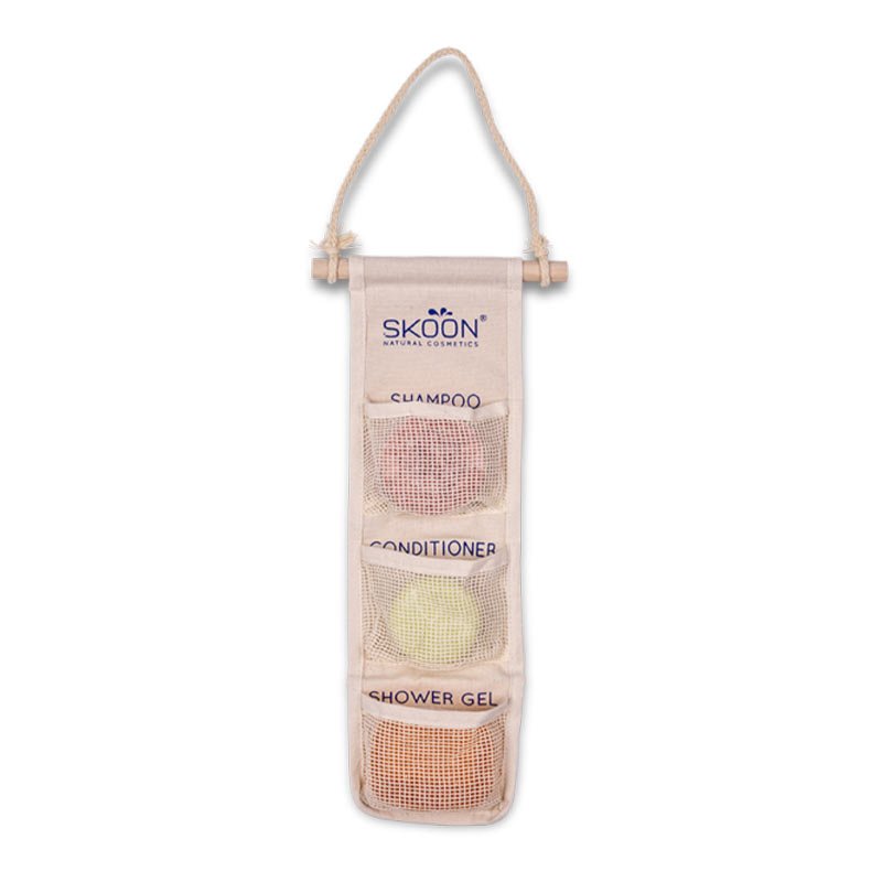 Skoon Solid Bar Organiser is an easy storage hack for your solid bars. The most important thing about caring for your solid bars is letting them dry properly, so you get longer-use from each bar, this storage makes drying easy! Made from netted cotton and wood, this Bar Organiser can be hung up in your bathroom by its handle, for easy access to your bars and a clean, organised bathroom. The natural cotton is machine washable, to keep it fresh, and has three compartments for all your solid bars.